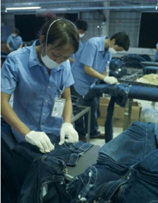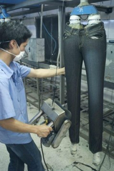 三:臭氧氧化與傳統(tǒng)方法的優(yōu)缺點比較 1. 用次氯酸鈉(婆梅度為18度)經(jīng)濟(jì);不好控制,有傷布的纖維。健康危害:經(jīng)常用手接觸本品的工人,手掌大量出汗,指甲變薄,毛發(fā)脫落。本品有致敏作用。本品放出的氯氣有可能引起中毒。具腐蝕性,可致人體灼傷,具致敏性。 2. 用亞氯酸鈉和硫酸在加次氯酸鈉。價格比上一種高點。但比上一種好點。不傷布的纖維。亞氯酸鈉有強(qiáng)氧化性。在175℃時即分解而發(fā)熱,與可燃物質(zhì)接觸,即起猛烈爆炸,須注意安全。硫酸對環(huán)境有危害,對水體和土壤可造成酸性污染。具強(qiáng)腐蝕性、強(qiáng)刺激性,可致人體灼傷。 3. 高錳酸鉀、過醋酸和還原漂白方式 關(guān)于牛仔布漂白,除了用次氯酸鈉和亞氯酸鈉外,還可以用高錳酸鉀、過醋酸和還原漂白方式,具體需要根據(jù)牛仔布所用染料類型來選擇,傳統(tǒng)牛仔為還原淀籃染料,也有用硫化染料或直接染料代替,也有采用活性染料代替的,故此,需要根據(jù)具體情況考慮。 4. 臭氧氧化的優(yōu)點 a) 無污染,臭氧為純凈物。在常溫下,易分解,生成氧氣和氧原子 b) 臭氧的氧化能力極強(qiáng)。 c) 運(yùn)行成本低 四:手工處理 1.手擦 a) 在洗水前,通過使用砂輪滾動摩擦而使布面染料褪色,手擦的地方通常是脾位和臀位,人為的機(jī)械褪色,讓牛褲在洗水后顯得自然地懷舊和泛白 b) 噴沙和手擦效果接近,但對布紋的效果有差別。噴沙后布紋模糊,沉底,而手擦后布紋清晰凸顯